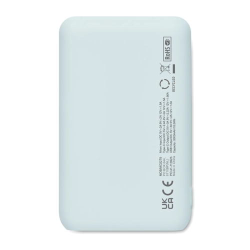 Power bank 5000 mAh in recycled ABS. Capacity for smartphone use, Output: 1 x Type-C, 2 x Type-A & 1 x Type-B. Input: 2-in-1 Type C & Type-A.