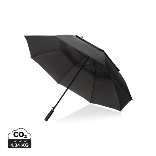This Swiss Peak AWARE™ Tornado 30" storm umbrella is durable and reliable made with a metal frame, fibreglass ribs and a rubber handle. It has a storm proof function for harsh weather and comes with a Swiss Peak pouch for easy storage. Auto-open and manual close. Additionally, the umbrella features an AWARE™ tracer that validates the use of recycled materials, making it the better choice. Plus, 2% of proceeds from each Aware™ product sold are donated to Water.org.